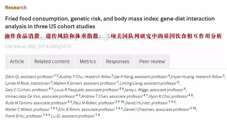 2014年一项来自哈佛公共卫生学院的研究,纳入了来自两个队列研究的9623名女性和6379名男性参与者,并在21421名女性中进行重复验证,发现:油炸食品摄入与肥胖相关的遗传易感性间存在交互作用。