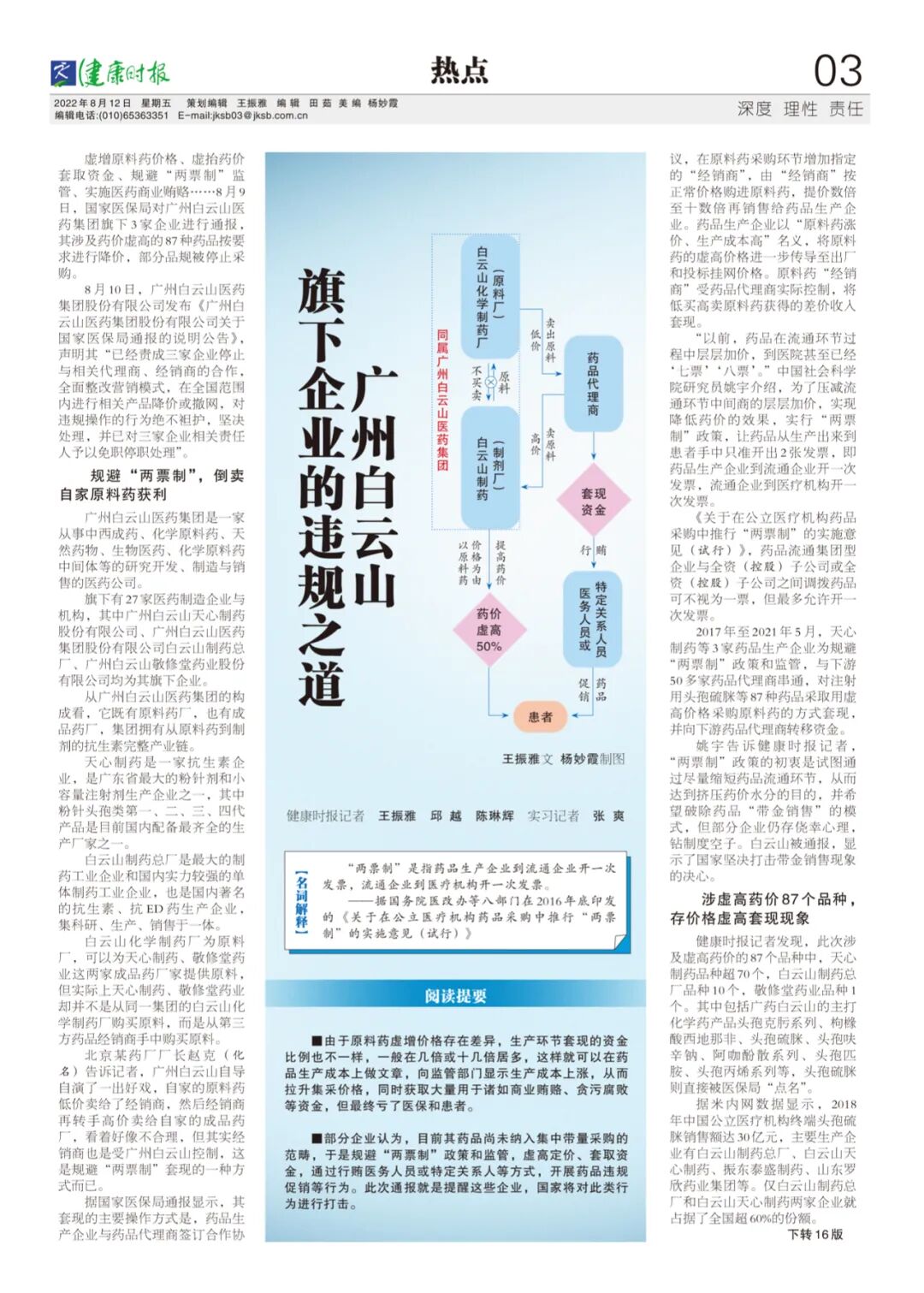 虚增原料药价格、虚抬药价套取资金、规避“两票制”监管、实施医药商业贿赂……8月9日,国家医保局对广州白云山医药集团旗下3家企业进行通报,其涉及药价虚高的87种药品按要求进行降价,部分品规被停止采购。