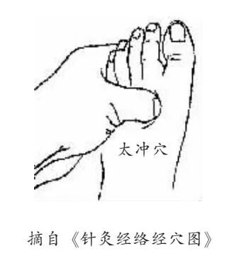 太冲穴:双手拇指按揉同侧足背的太冲穴(第1、2跖骨结合部前方凹陷中)3~5分钟,以局部酸胀为度,有助平肝息风、清热利湿、通络止痛。