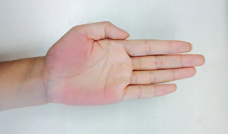 厦门大学附属中山医院肿瘤科副主任医师潘战和2022年7月在其微信公号刊文介绍,肝掌指患慢性肝炎特别是肝硬化后,在手掌大拇指和小指的根部的大小鱼际处皮肤出现片状充血,或是红色斑点、斑块,加压后变成苍白色。肝掌为慢性肝炎、肝硬化的重要标志之一。②