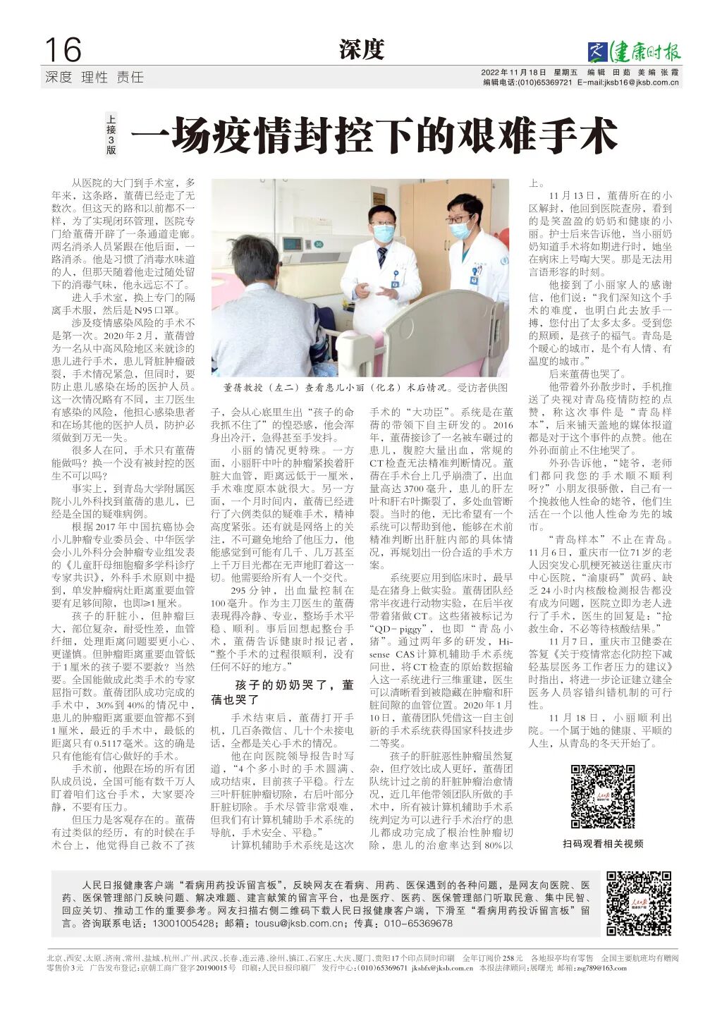 再次封控的消息是突然下达的,他束手无策。近两年来,董蒨一直在疫情第一线,他深知疫情防控的形势。回忆起当时写下朋友圈,董蒨说当时的心情过于复杂,悲伤、心痛、遗憾,但最主要的是自责。他是含泪写下那条朋友圈的:“孩子,对不起、对不起!我今天不能去救你了!”没想到朋友圈被截图传播到社交平台上,大家都是在网上看到董蒨需要做手术的消息。医院、青岛市卫健委、社区……所有人都准备把这件事情做成。11月8日当晚,青岛市疫情防控指挥部发出紧急通知,建立疫情期间临时管控区内医护专家紧急出诊绿色通道。“无论如何,一定要救孩子”,这是所有人的共识。当晚,董蒨发布朋友圈,11月9日将如期进行手术。11月9日,董蒨在社区工作人员的安排下进入医院专门安排的负压救护车。救护车在负压的状况下,车内气压低于车外,车内空气一旦要排出,需要经过无害化处理,可以最大程度减少交叉感染。因此,负压救护车也被称为“最强口罩”。 从医院的大门到手术室,多年来,这条路,董蒨已经走了无数次。但这天的路和以前都不一样,为了实现闭环管理,医院专门给董蒨开辟了一条通道走廊。两名消杀人员紧跟在他后面,一路消杀。他是习惯了消毒水味道的人,但那天随着他走过随处留下的消毒气味,他永远忘不了。进入手术室,换上专门的隔离手术服,然后是N95口罩。涉及疫情感染风险的手术不是第一次。2020年2月,董蒨曾为一名从中高风险地区来就诊的患儿进行手术,患儿肾脏肿瘤破裂,手术情况紧急,但同时,要防止患儿感染在场的医护人员。这一次情况略有不同,主刀医生有感染的风险,他担心感染患者和在场其他的医护人员,防护必须做到万无一失。很多人在问,手术只有董蒨能做吗?换一个没有被封控的医生不可以吗?事实上,到青岛大学附属医院小儿外科找到董蒨的患儿,已经是全国的疑难病例。根据2017年中国抗癌协会小儿肿瘤专业委员会、中华医学会小儿外科分会肿瘤专业组发表的《儿童肝母细胞瘤多学科诊疗专家共识》,外科手术原则中提到,单发肿瘤病灶距离重要血管要有足够间隙,也即≥1厘米。孩子的肝脏小,但肿瘤巨大,部位复杂,耐受性差,血管纤细,处理距离问题要更小心、更谨慎。但肿瘤距离重要血管低于1厘米的孩子要不要救?当然要。全国能做成此类手术的专家屈指可数。董蒨团队成功完成的手术中,30%到40%的情况中,患儿的肿瘤距离重要血管都不到1厘米,最近的手术中,最低的距离只有0.5117毫米。这的确是只有他能有信心做好的手术。