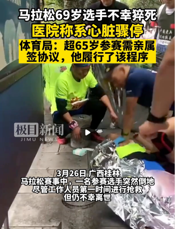 3月28日极目新闻报道,桂林市体育局工作人员表示,这名参赛选手跑出去1公里多就倒了,附近的救护车马上赶了过去。这名参赛选手69岁,超过65岁的选手参赛需要直系亲属签署协议,这些程序已经履行,是一个意外。①