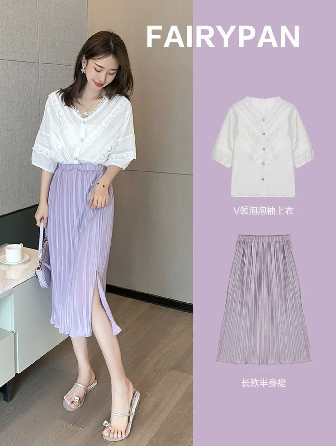 v领小衫+开衩半裙,很养眼的一套俏丽套装,任何年龄段都能拿得出手,也能够轻松hold住,飘逸半裙气质甜美。