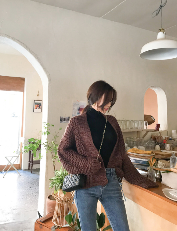 孙允珠每日一珠 孙允珠深棕小开衫+时尚修身牛仔 侧身翘臀很迷人