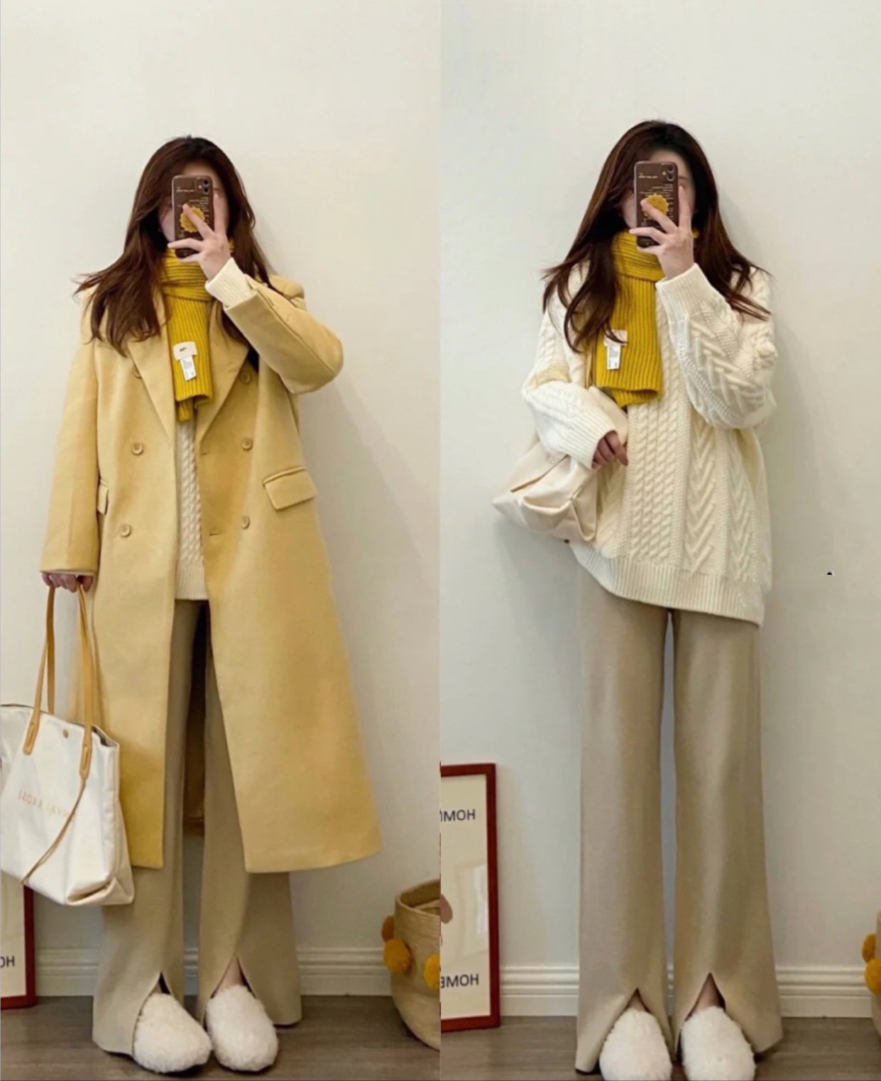 不过“长长结合”容易显拖沓,对小个子女生不太友好,这个时候可以让内搭同色,比如这样的白色毛衣搭配浅卡其裤子,内搭呈现出纵向延伸的H型,就能拔高身材。