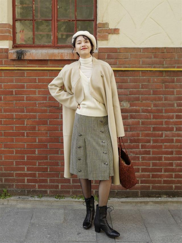 想要告别土气感,在大衣的搭配上一定要注意露肤感。除了短裙配长靴的基础搭配,想要在冬天有一定保暖效果的姐妹们,不妨试试这种开衩的一步裙搭配。