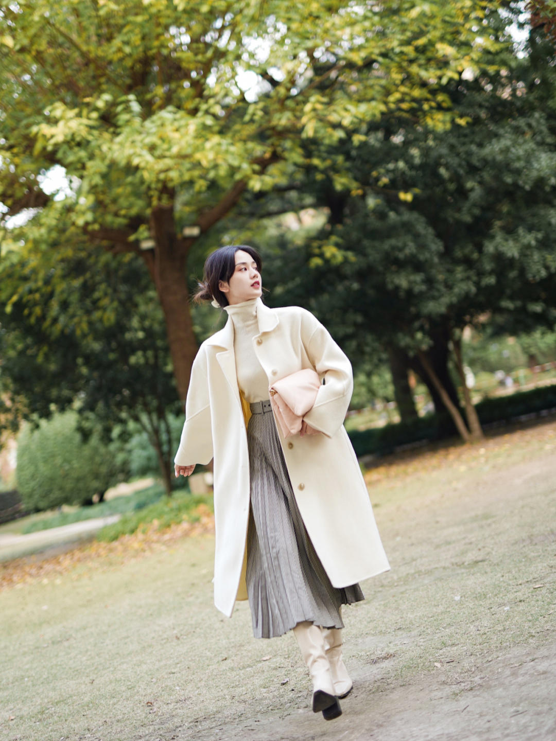 如果你走的是比较低调的路线,那么我建议你看看下面这款造型,是非常适合熟女的looks,白色大衣偏暖色调,所以不会让人觉得苍白生冷,搭配同色高领毛衣看起来非常清爽,太适合温柔优雅的女性。