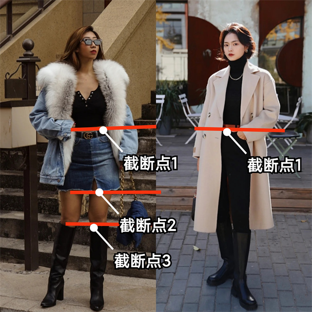 短裙和上衣内搭的高腰线形成一个截断,短裙下摆和大腿处的交界线形成一个截断,靴子和腿部的交界线形成第三个截断。