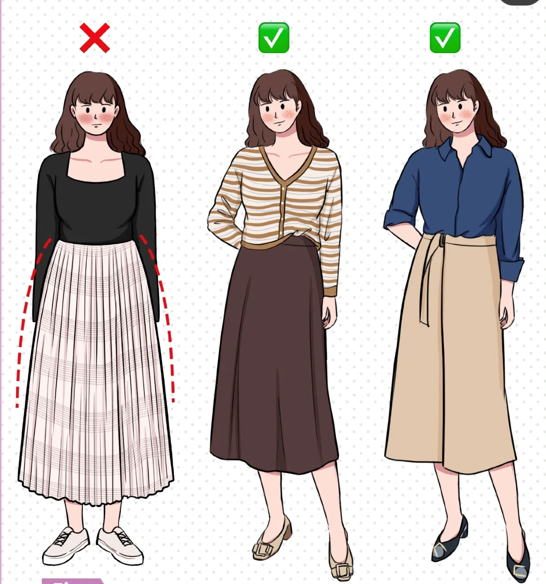 小啾会更建议姐妹们选择版型利落、线条干净的半身裙,这类的半身裙不容易带来横向的膨胀感,也更不容易挑剔身材,再搭配高腰和硬挺的材质也会在视觉上制造出干练优雅的气质。