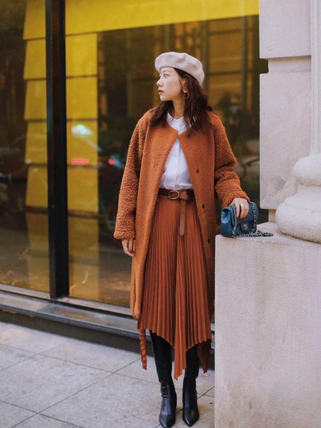 不只是日常简约风,棕色毛呢大衣搭配撞色百褶裙碰撞出的是一种英伦风的文艺复古气质。整体的格调是高端大气的,比较适合30岁左右的姐妹穿。在这类搭配时,为了整体的风格一致,建议搭配复古风的配饰以及鞋子。