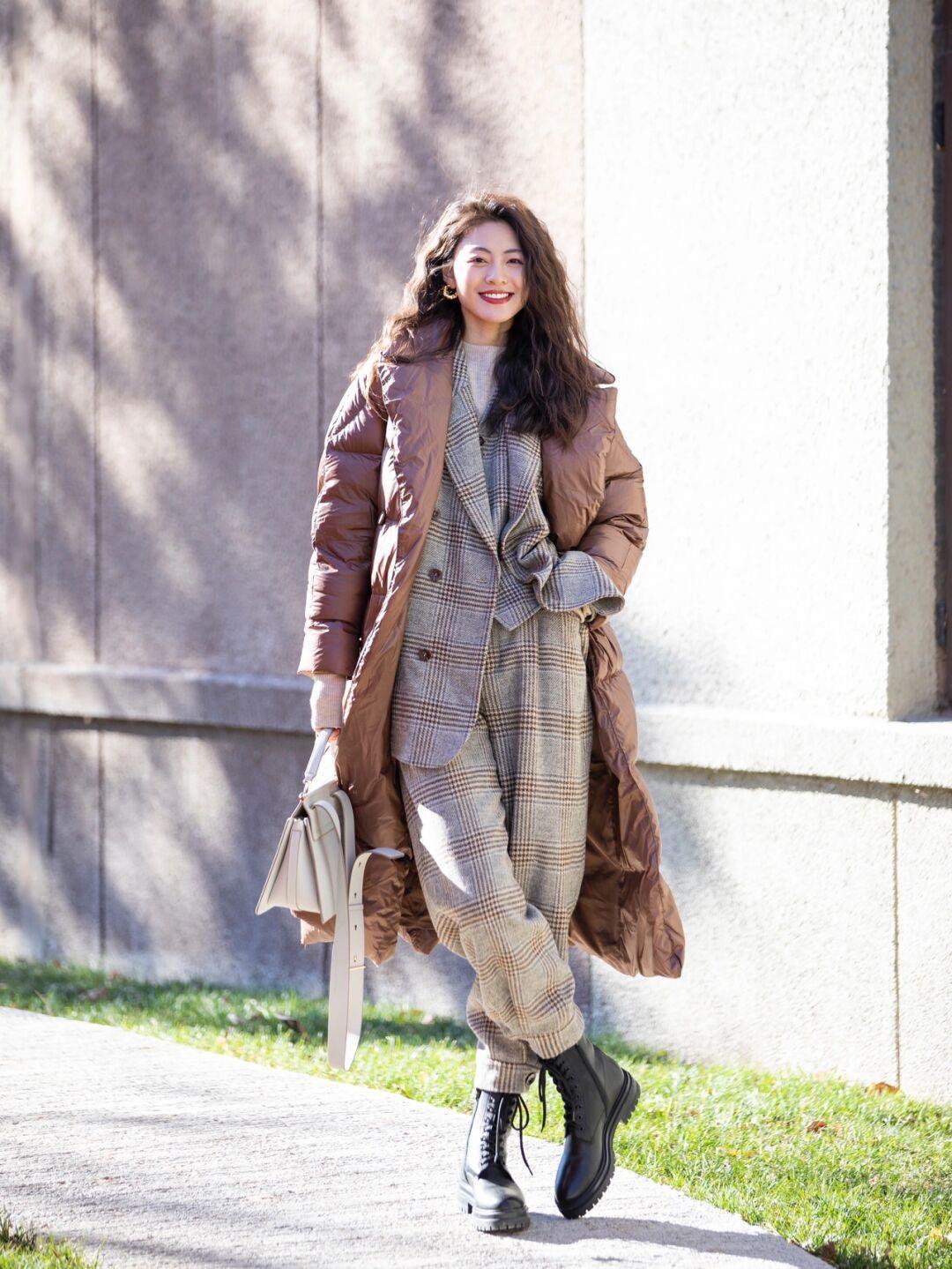 如果你的穿搭意识比较薄弱,那么可以借鉴一些博主的造型,选择一身格纹西装套装作为内搭,这就能打造出丰富的层次,并起到顺延视觉效果的作用,会大大提升整体的协调度,还会注入几分大女人的气质。