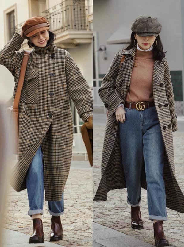 比起纯色系的长款大衣,Lily觉得这种格纹元素的大衣穿起来更加有味道,自带满满复古范的,有木有?三木博主身上穿的这件茧型的长款大衣,穿起来走路都带风,关键是对于身材的包容性极佳!