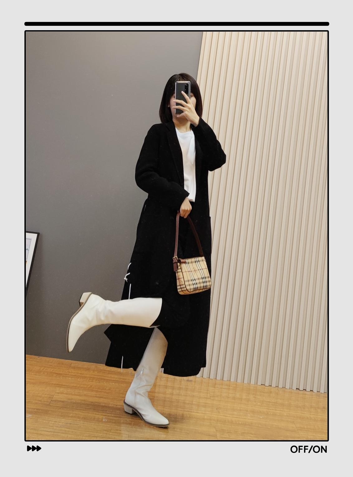 大衣和卫衣都已经有了,下装就可以来点小花样了。白色中筒靴和小黑裤的组合,保暖又时髦,还很个性
