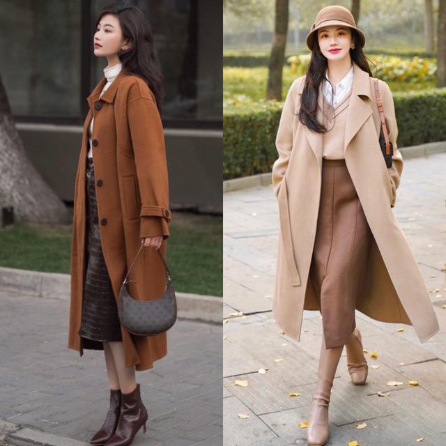 大地色系的毛呢大衣,能着重突出自己的知性女人味,再搭配一款柔和淑女的半身裙,显成熟性感。而长靴的加入,则为造型增添了几分利落感,甜酷结合。