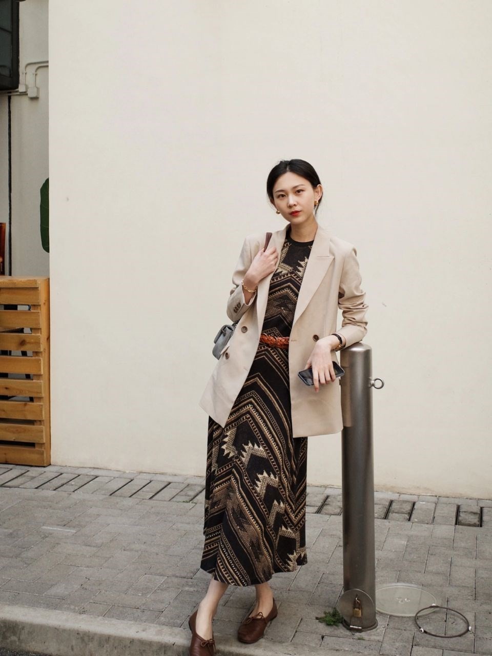 当然,若是连衣裙对于腰线的处理并不是特别明显,我们可以借助腰带等细节单品进行具体点缀,不仅十分修饰身形还能轻松增加造型精致度,与短上衣组合在一起很得体和谐。