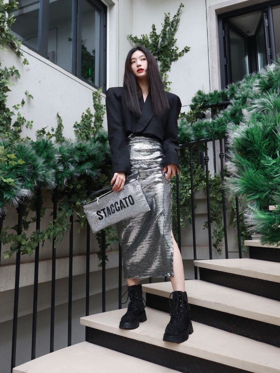 对于肩窄的姐妹建议可以试试垫肩短西装搭配连衣裙,直挺的垫肩设计不仅十分修饰个人头肩比,也让西装更加个性有型,不是过于无趣且死板。下半身同样搭配一款线条感极强的连衣裙,会特别修饰个人身形,让整个人看起来高挑又利落,像这个裙装还适当加入了开叉设计,使得造型更夺目吸睛了。