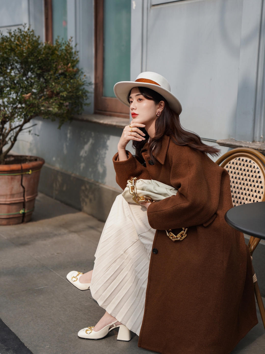 对于小矮子来说,不要总是选择拖地款式的裤装,那样很容易穿出邋遢的感觉,要学会利用连衣裙来打造层次,像博主下面的造型,整体以深栗色的大衣为主,本就长度至膝盖,所以搭配略长一点的裙装就足够,简洁又大气。
