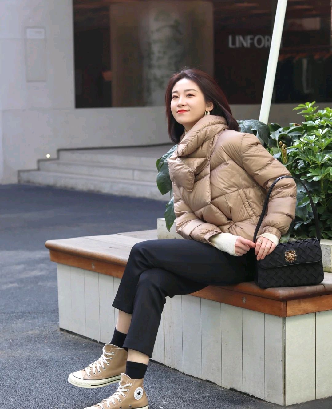 这位时尚博主不仅选对了羽绒服,还选对了裤子,她所选择的裤子虽然简简单单,但是包容性很强。