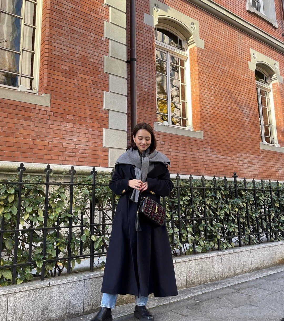 女性一旦到了四五十岁之后,普遍追求低调又显成熟的搭配,像这款黑色呢子大衣和灰色毛衣披肩的造型就完美地符合了这一点。简约大气的灰白配色和穿着者本身的沉稳气质是相称的,下半身的牛仔裤和短靴赋予了穿搭更多干练气息。