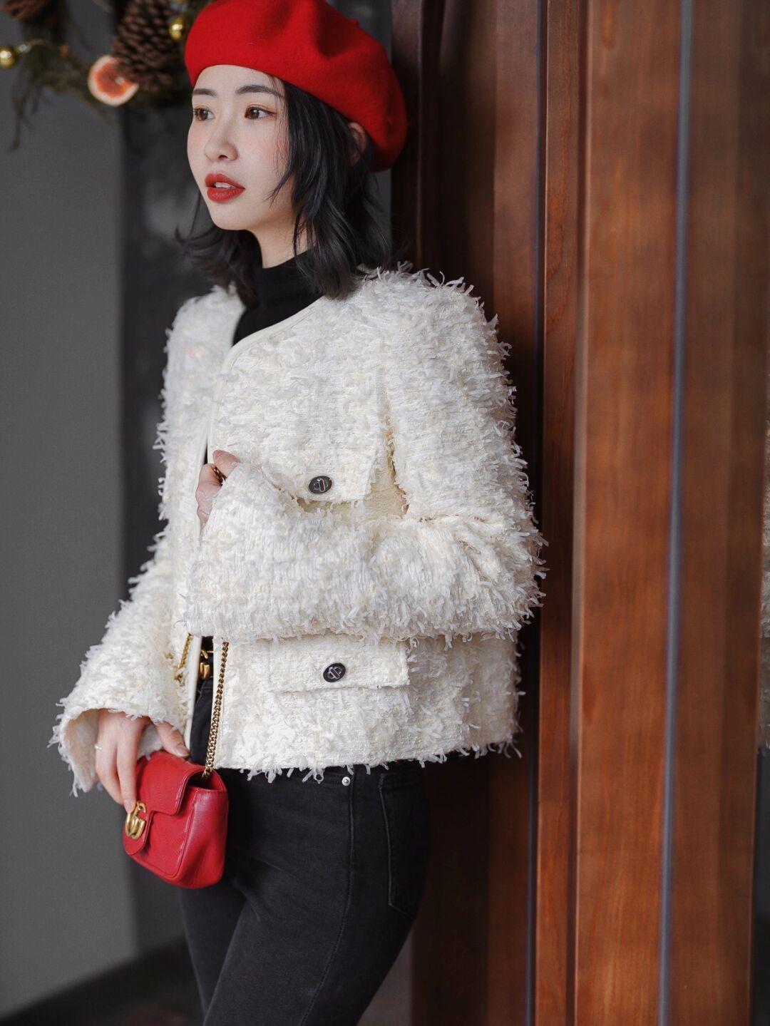 接下来介绍的是一件白色的小香风外套,它的款式比较独特,在身上融入了流苏毛绒的拼接,看起来非常优雅高贵,是精致小女人的最爱,白色与黑色一样都是基础色,是无论怎么穿都不会出错的,非常值得你入手。