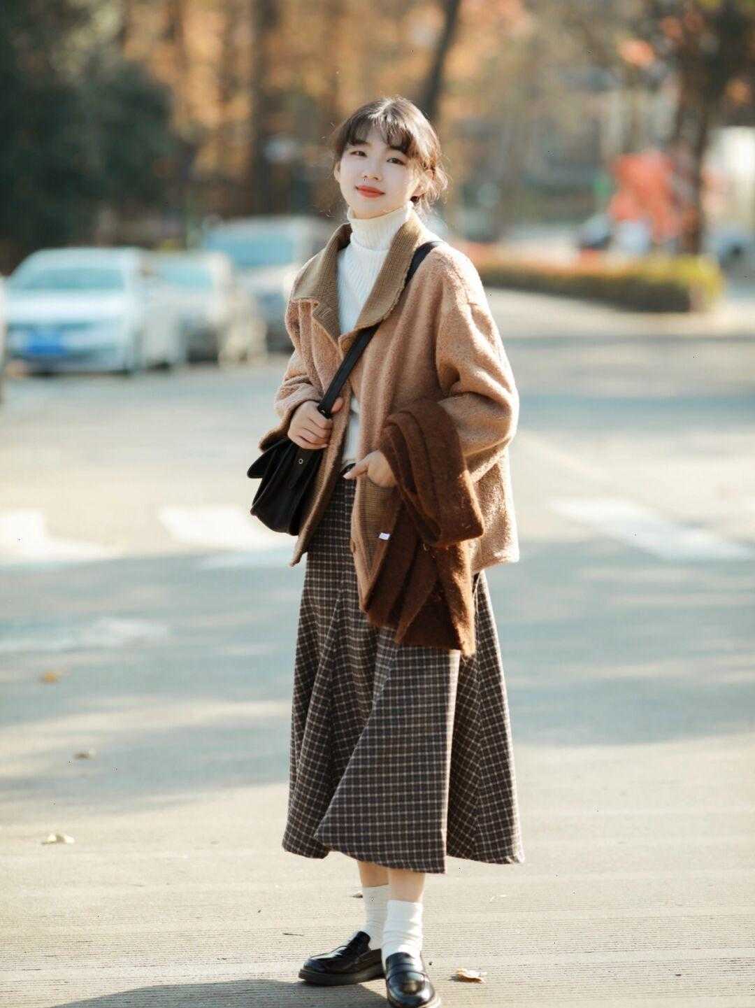 短款羊羔毛外套和格纹半身裙结合起来,毫不费力就可以演绎出高级感,这种深棕色很适合冬季。搭配了白色高领衫,温柔清新,还可以叠穿起来增强层次感,再加上下半身搭配格纹半身裙,也体现了复古魅力,并不会觉得臃肿。