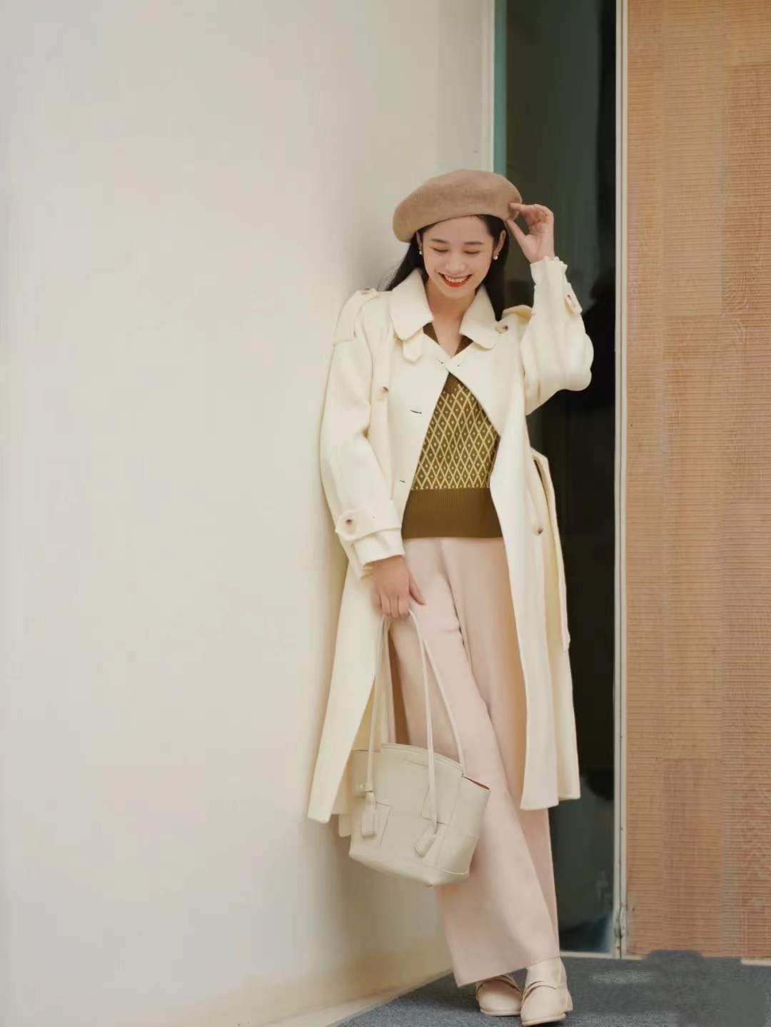 不管是淑女风,还是优雅风,抑或者职场干练穿搭。剪裁流畅的米白色大衣,都是当仁不让的首选。米白色奶呼呼的非常细腻温和,更加适合软萌的妹子。组合柔软细腻的针织衫,更彰显温柔的气质。
