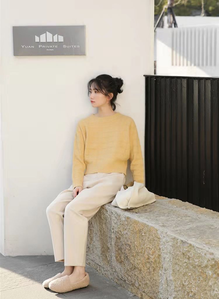除了优雅的半身裙,毛衣自然还可以用来搭配利落的裤装,如上图中选择色调温柔的浅黄色毛衣搭配白色的裤子,非常简单地搭配,却演绎出不费力的时髦模样。这样的组合不仅能表达出女性柔和的气质,还可以外搭各种类型的大衣,打造出新的时尚造型。