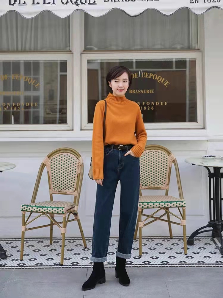毛衣搭配也是需要我们考虑到上下装的颜色问题,才能穿出更多的时尚效果。如上图中采用撞色穿搭方式,选择姜黄色的毛衣搭配深蓝色的牛仔裤,在视觉上不用担心会有突兀感,反而不落于俗套,穿出有着不同的美感。