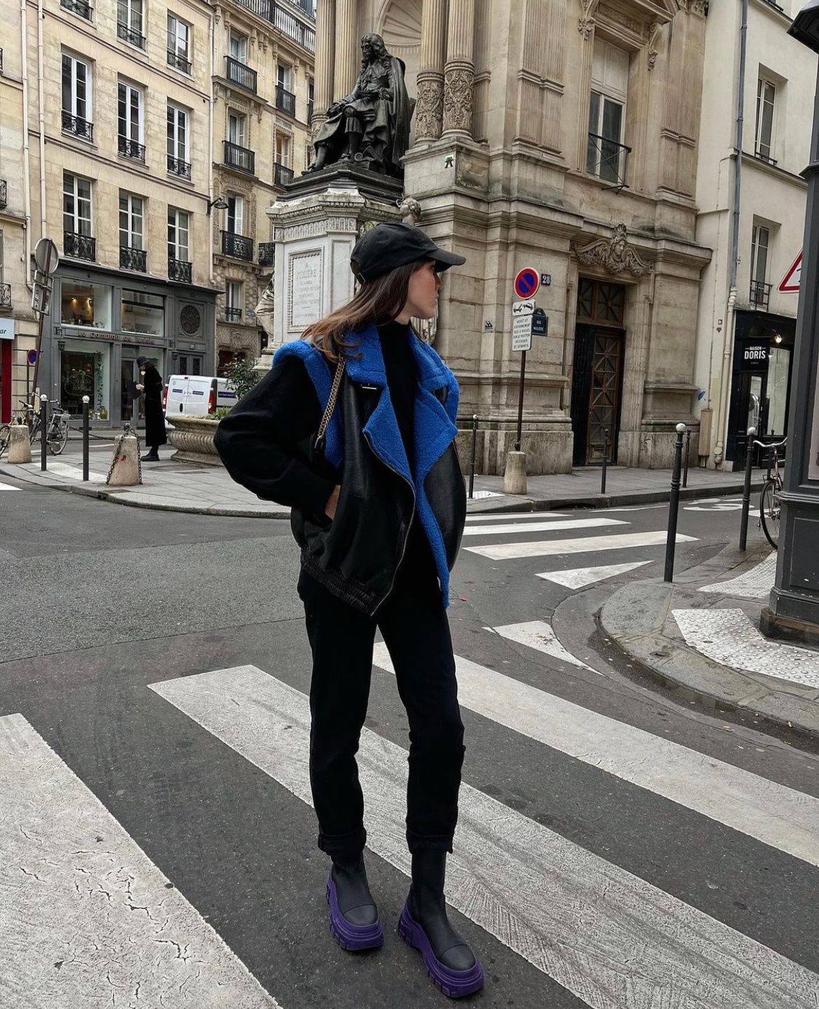 由于紫色的面积较小,鞋面有黑色来平衡,再搭配包容性极强的小黑裤,根本不用担心会显浮夸的问题。个性而不浮夸,免去不少后顾之忧。