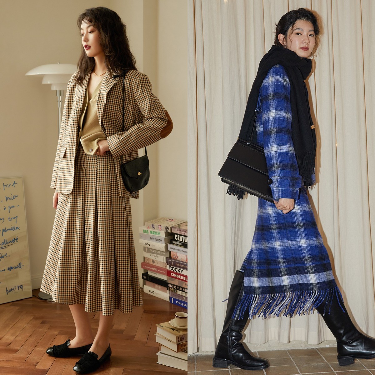 除了可以根据格纹的颜色挑选,我们还可以从裙摆的设计上着手。比较低调有气质的格纹伞裙就很适合30岁以上的女人入手,既优雅还很复古,同时还利用伞状裙带增添了温柔属性,很有“轻熟风”的效果。