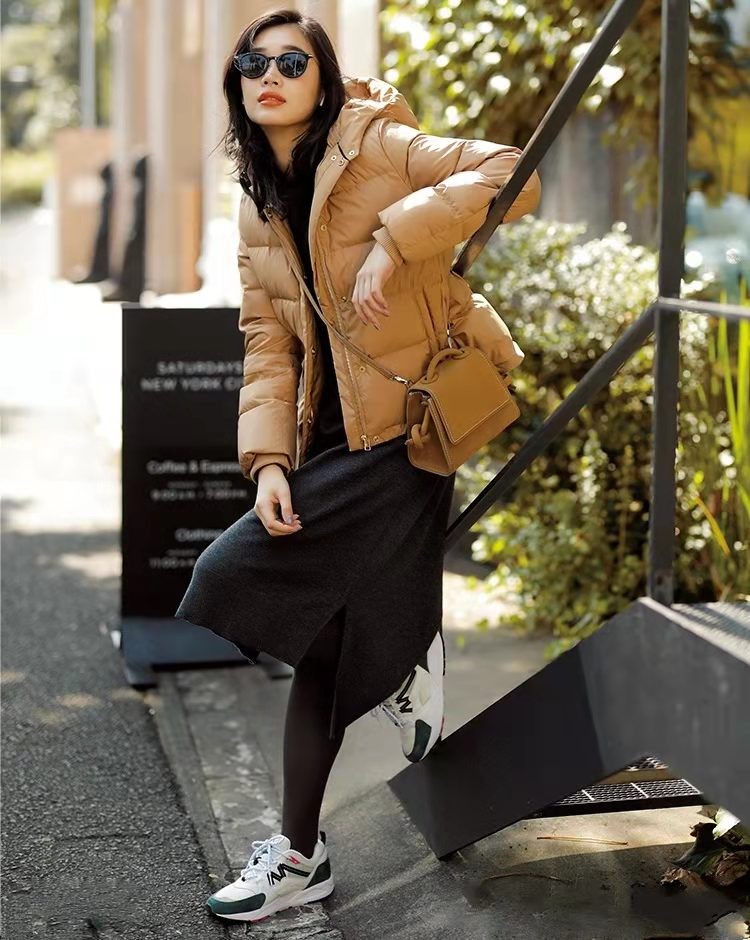 这种深色系的棉服上身之后具有不错的显白效果,而且用来搭配黑色直筒开叉半裙和黑色打底袜,淑女又有个性,脚上的白色运动鞋为造型增添了活泼与减龄感,满满的精致优雅风格。