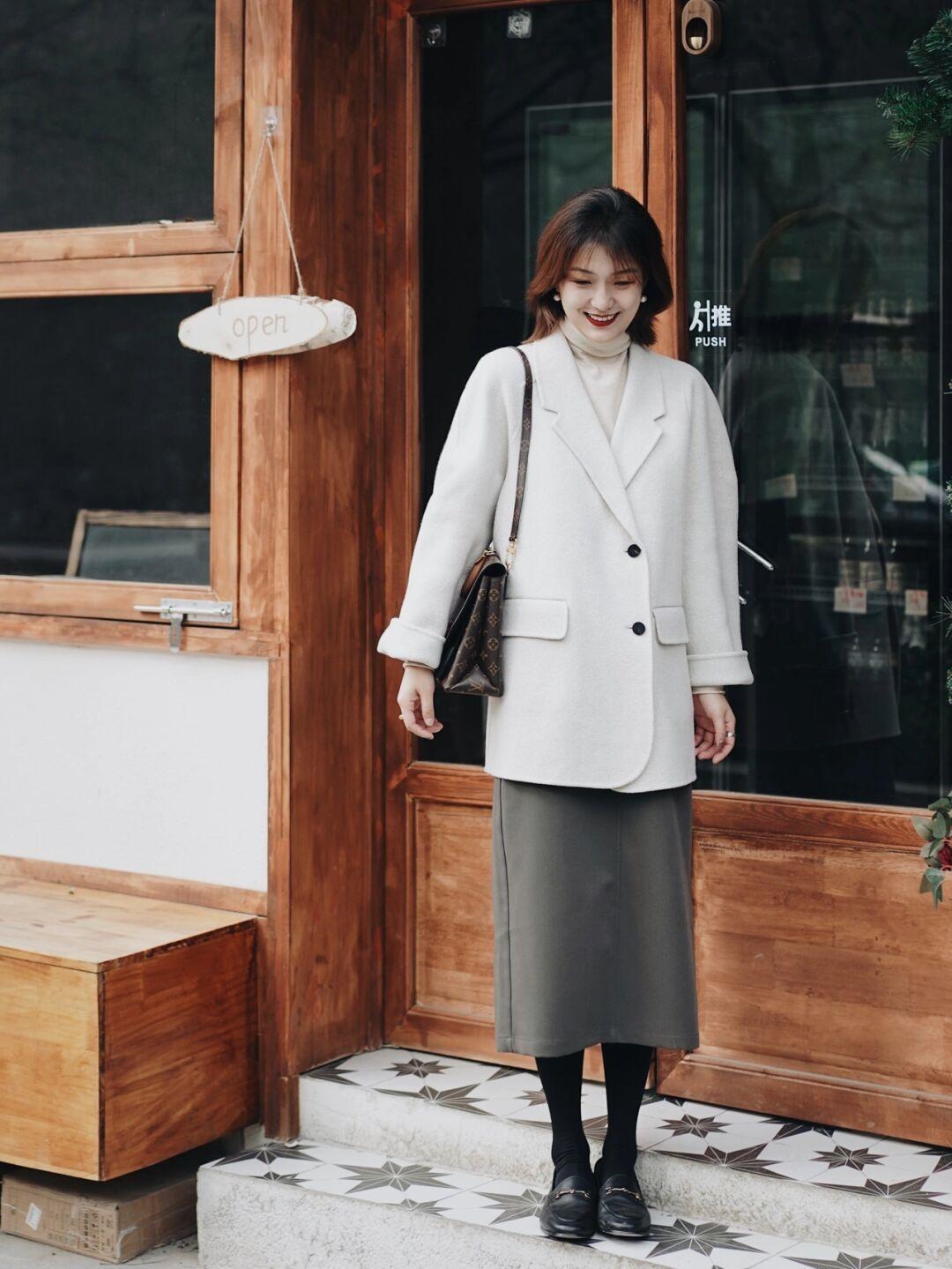 内搭是一件白色高领毛衣,它的优势众多,与白色大衣也能完美适配,高领设计会修饰脖颈线条,从而起到防钻风的作用,配色方面二者看起来也非常和谐自然,建议有条件的美眉人手一件,不管配谁都好看。