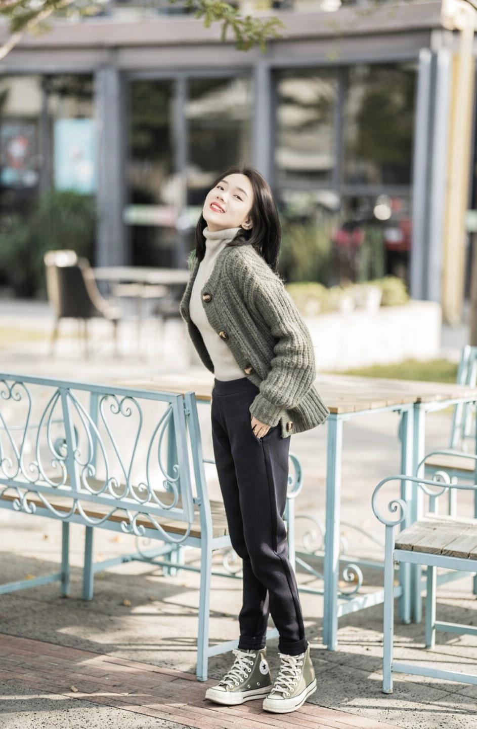 毛衣的款式众多,如果你追求宽松与百搭,就可以入手一款深灰色的毛衣开衫,它质地厚实,保暖性很强,穿在身上会得到非常舒适的体验。一般来说,毛衣开衫的版型宽松,对微胖姐妹很友好,但不建议太过肩宽厚背的姐妹尝试,那样反而会穿出臃肿感。