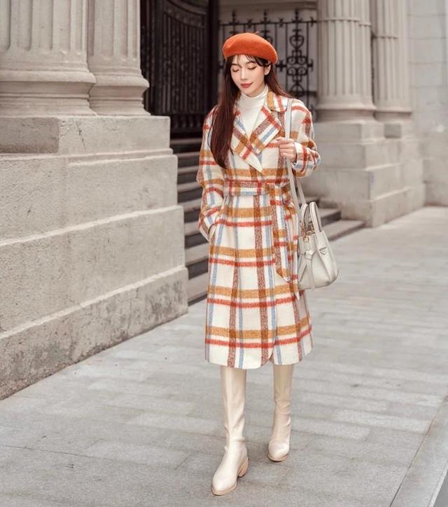 搭配Look3:橙色格纹大衣+米白色无痕长靴