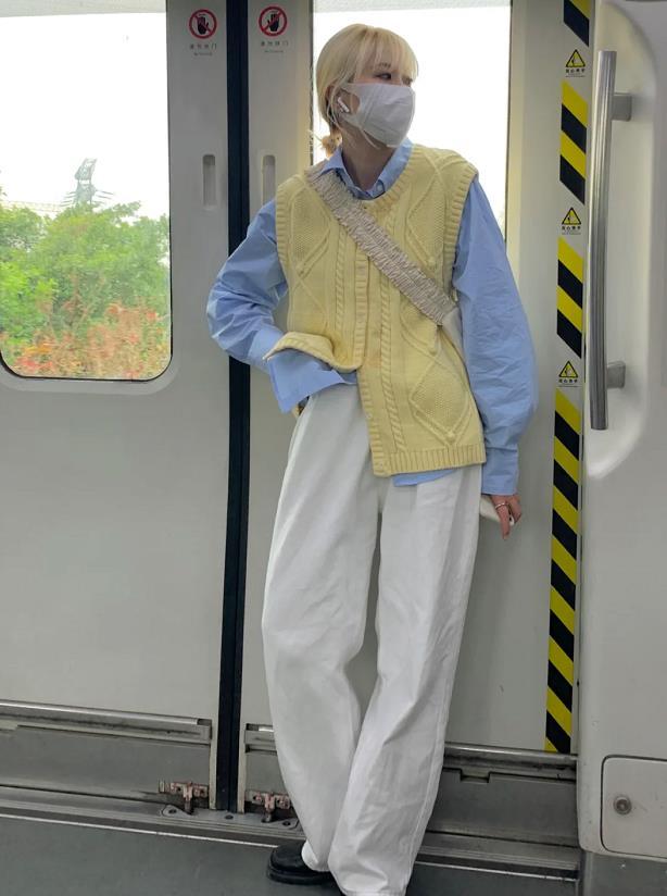 叠穿这种搭配方式,在秋冬季节是很适用的,因为很保暖,当然了,到了春天,叠穿照样可以利用起来。借鉴下这位潮人的穿搭,真的怎么看都觉得时尚,奶黄色毛衣马甲+蓝色衬衫,回暖后的春天这么穿很合适,下身一条白色宽松长裤子,这种版型的裤子,穿起来就是显瘦!