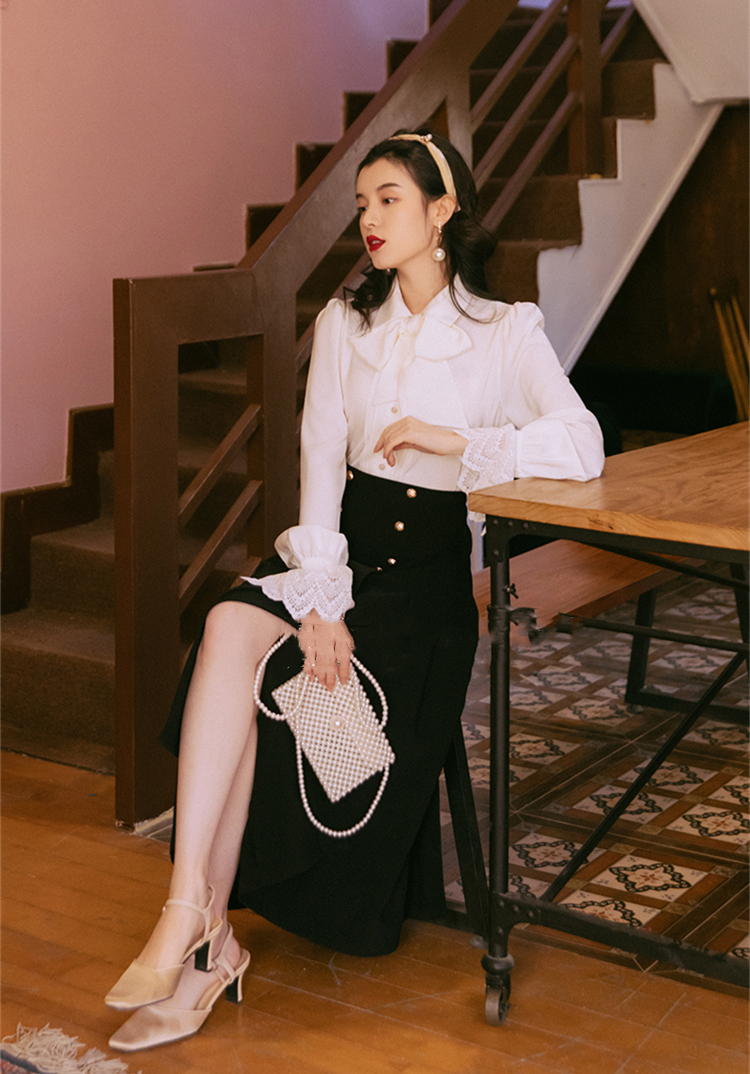 但如果你的年龄超过了30岁,更喜欢轻熟风一些的穿搭,那不妨入手飘带领或是带有蕾丝花边元素的成衣款式。飘带领衬衣比较知性高级,且飘带的设计可塑性极强,既可以打结系在脖颈上又能随意搭在衬衣两侧,与半身裙结合,轻松打造出知性范儿。