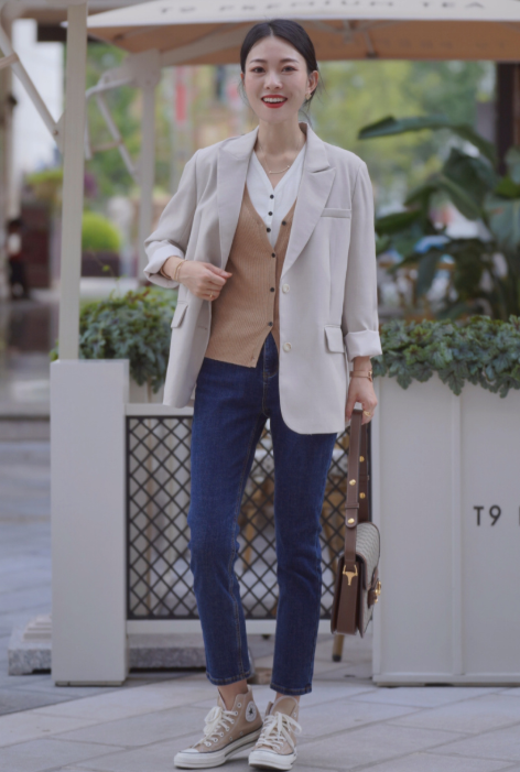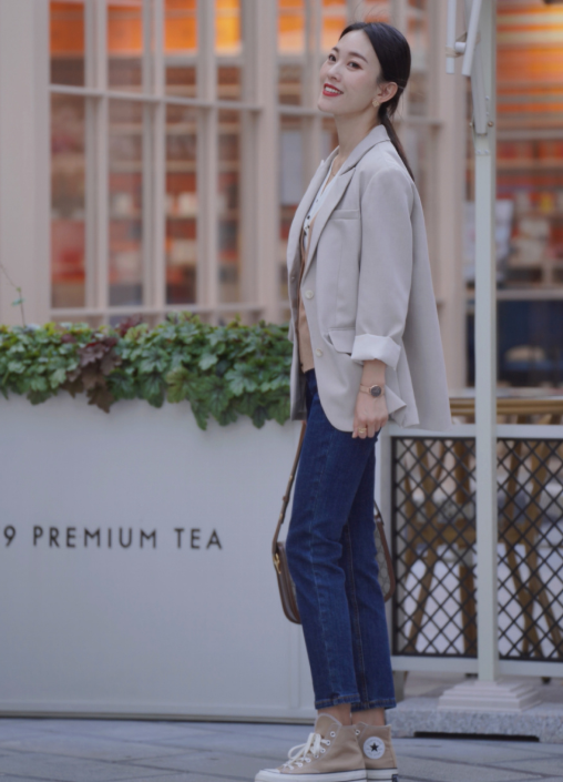 穿上西装,我们不一定只能搭配裙装服饰来体现温柔的魅力,还可以搭配牛仔裤,风格休闲简约,更加适合日常,而且大部分的女孩子都可以驾驭,学起来并不困难,只要你再搭配合适的鞋子,一定会变得更加时髦有气质。