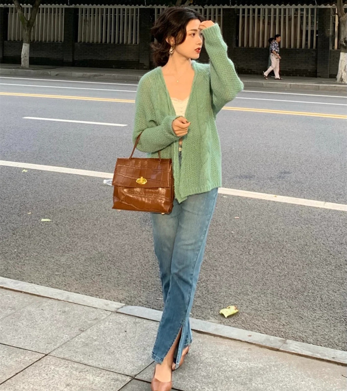 翠绿色针织开衫+白色吊带+蓝色牛仔裤,打造出跟春季最为相衬的清爽和减龄,整体造型没有过多加入装饰和设计感因素,反而是凭借着协调且自然的配色占据上风。