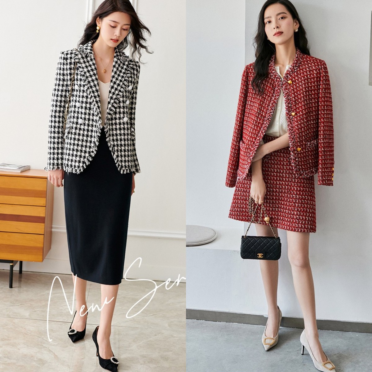 在具体搭配时,我们就可根据自己的风格路线来决定。对于40岁女人来讲,最不能错过的穿法就是“优雅轻熟风”穿搭,既能展现自己知性高贵的魅力,又能凸显女人味。比较高级显贵的穿法,就是像下图中这样用小香风外套搭配裙装,小香风外套在时尚圈中可谓是经久不衰的款式,自带贵气感,与裙装结合轻松穿出名媛范儿。
