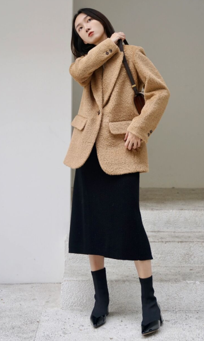 下半身搭配着黑色半身裙,优雅时髦,这条半身裙和西装的结合会非常温柔优雅,能够大大提升你的女人味,展现出独特的魅力,建议大家在平时都可以参考起来。