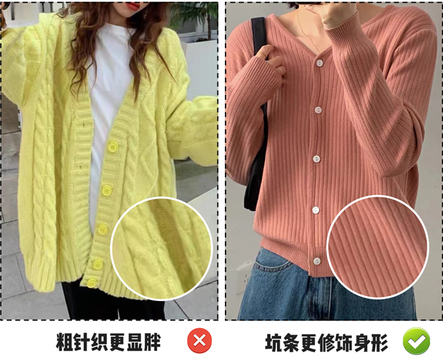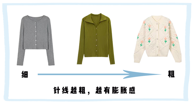 根据下面的图片对比我们可以发现,大多数细针线的针织衫都是较为修身的,显瘦效果也会更好,但是粗针织的针织衫就会比较膨胀,因此在选择开衫的时候尽量还是以细针线为主。