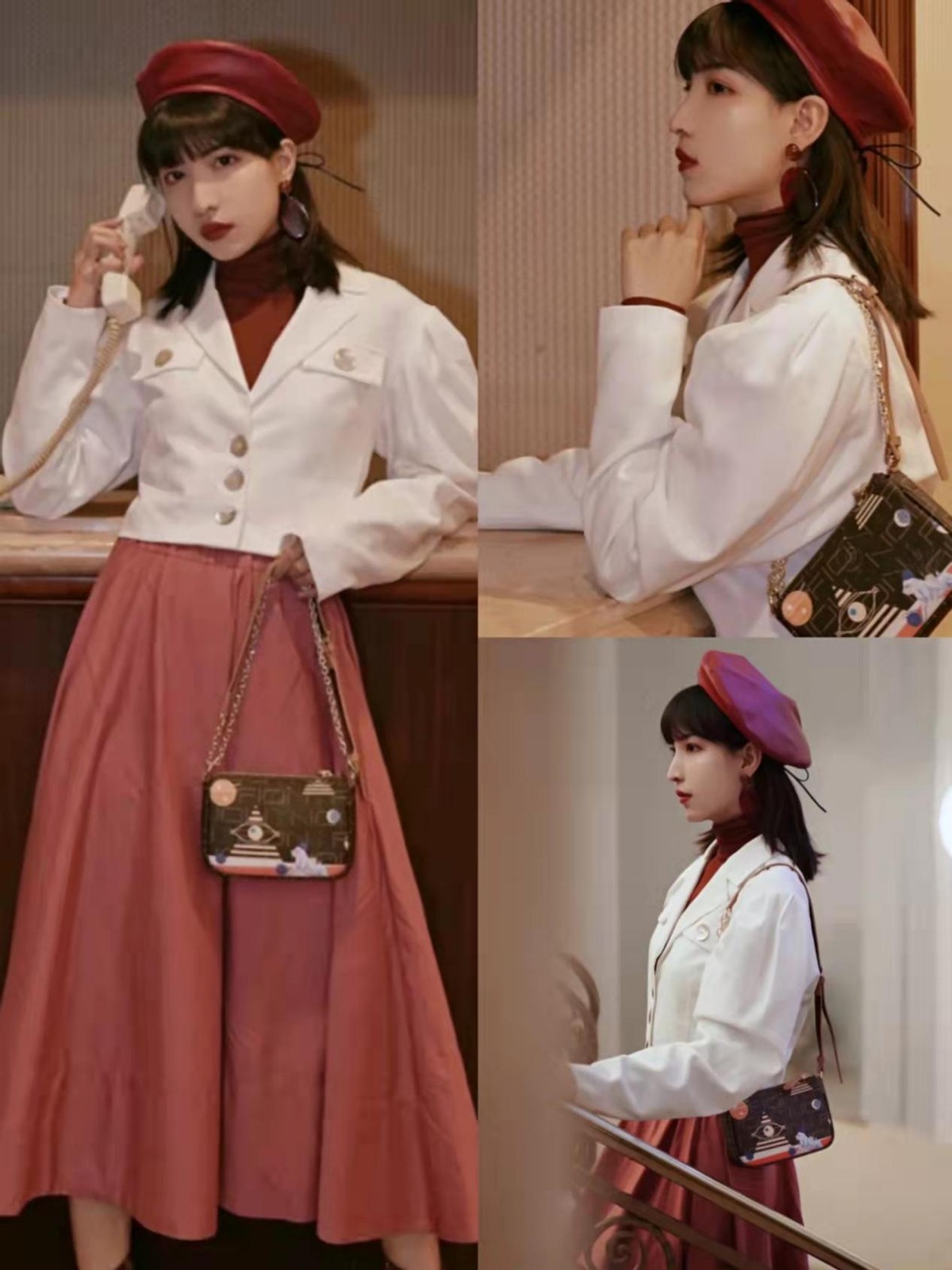 采用了“上短下长”的搭配方式,提升腰线更显身材高挑。红色的贝雷帽和红色的打底衣,颜色鲜活亮丽,形成小面积的亮色点缀。穿搭的颜色也更加丰富,整体看起来也更加亮眼吸睛了。