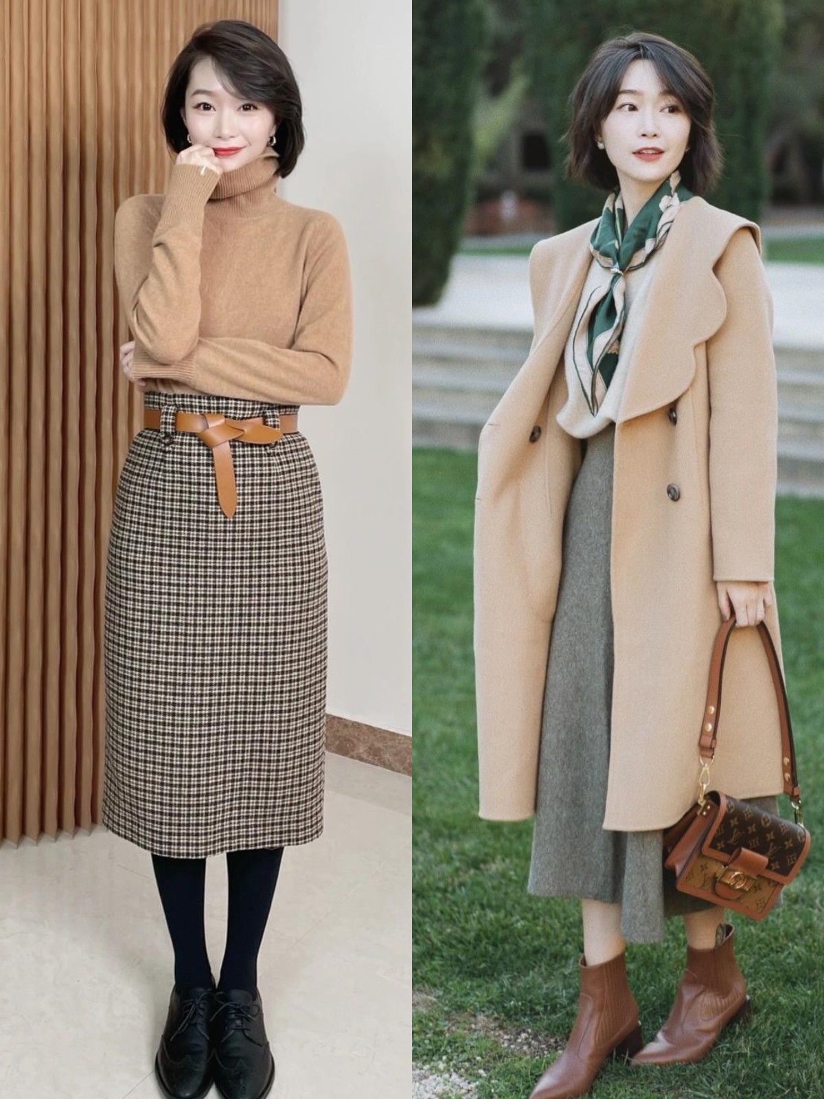 要想穿出保暖效果更好一些的穿法,我们还可尝试材质相对厚实一些的毛呢半身裙。毛呢半身裙在职场穿搭中有着极高的出场率,上身后不仅能打造出知性高级的气场,还能利用厚实的材质加强保暖度使用还很时髦。