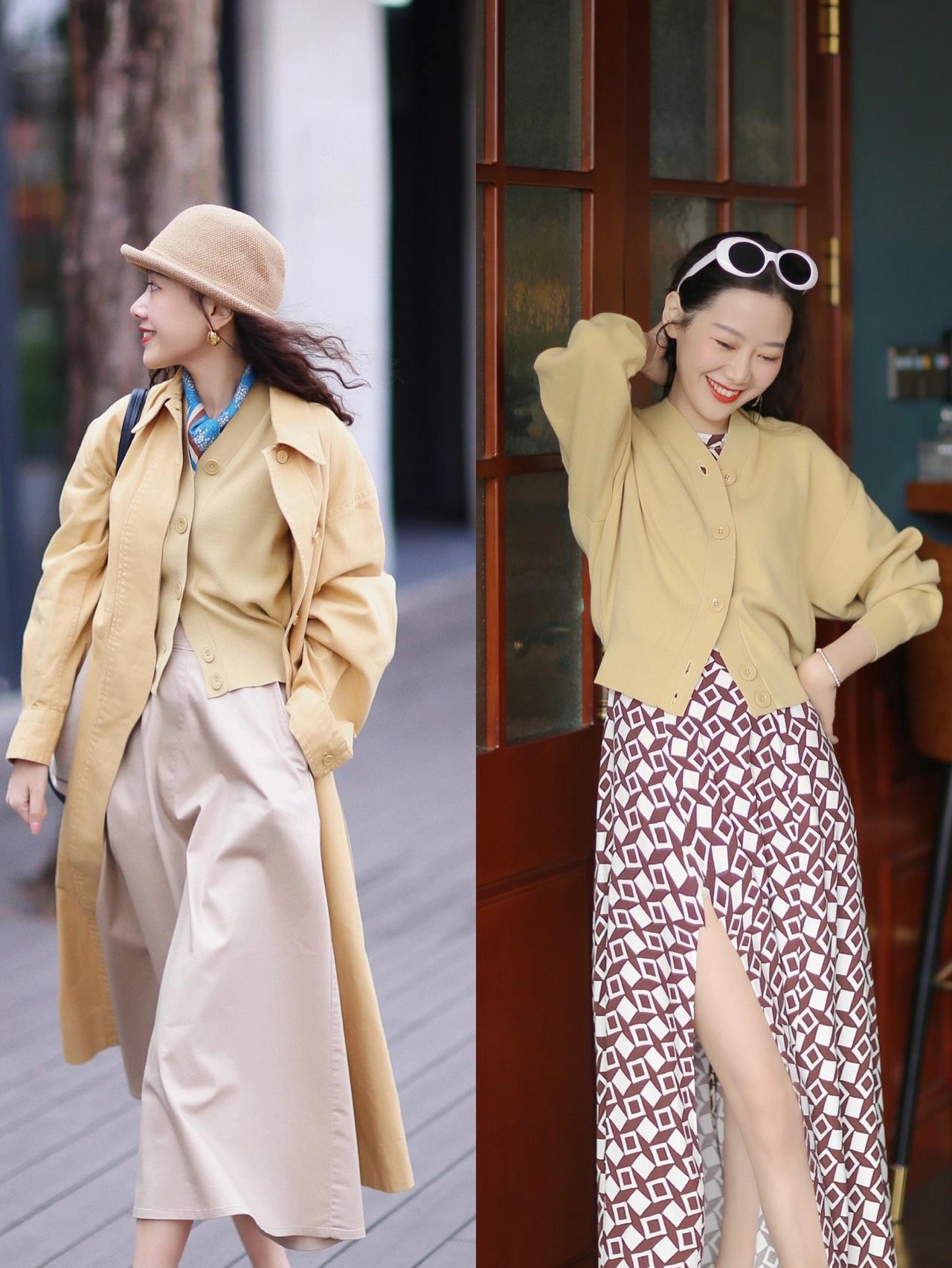 最后就是在颜色搭配上,如果你更喜欢低调一些的配色,那就可用相近色系结合在一起,例如下图(左图)中的这种浅咖色与杏色的组合,就是很不错的选择,既打造出了层次感,又能稳定整体色调,很有轻熟风效果。但若是你更喜欢回头率高一些的穿法,那就比较推荐你用纯色上衣搭配带有多色元素的裙装。增添造型的色彩感,看起来会更加抓人眼球。