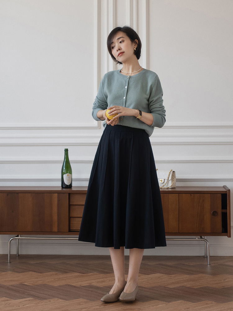 要想显瘦,最好还是选择黑色,黑色针织衫最适合上半身微胖的女性,能够从视觉上达到显瘦的效果,就比如下面的博主用v领的黑色针织衫凹造型,看上去的确很苗条,和百褶半身裙的搭配也并不沉闷。