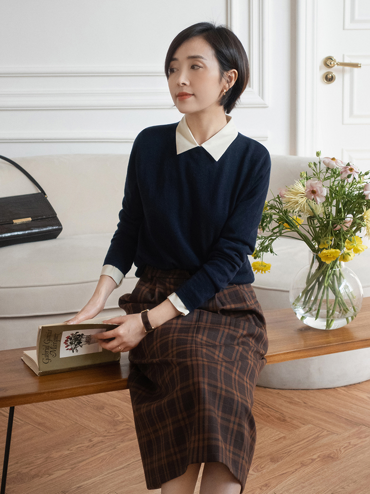 因为是纯色针织衫,所以博主在下半身搭配着格纹的半身裙。用这种格纹的裙装凹造型,会很好的体现出复古感,也能够凸显出温柔知性的魅力。搭配着粗跟的小皮鞋,怎么看都很优雅呢,约会时一定要尝试。