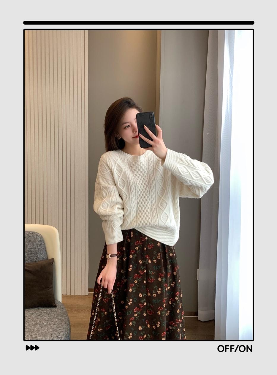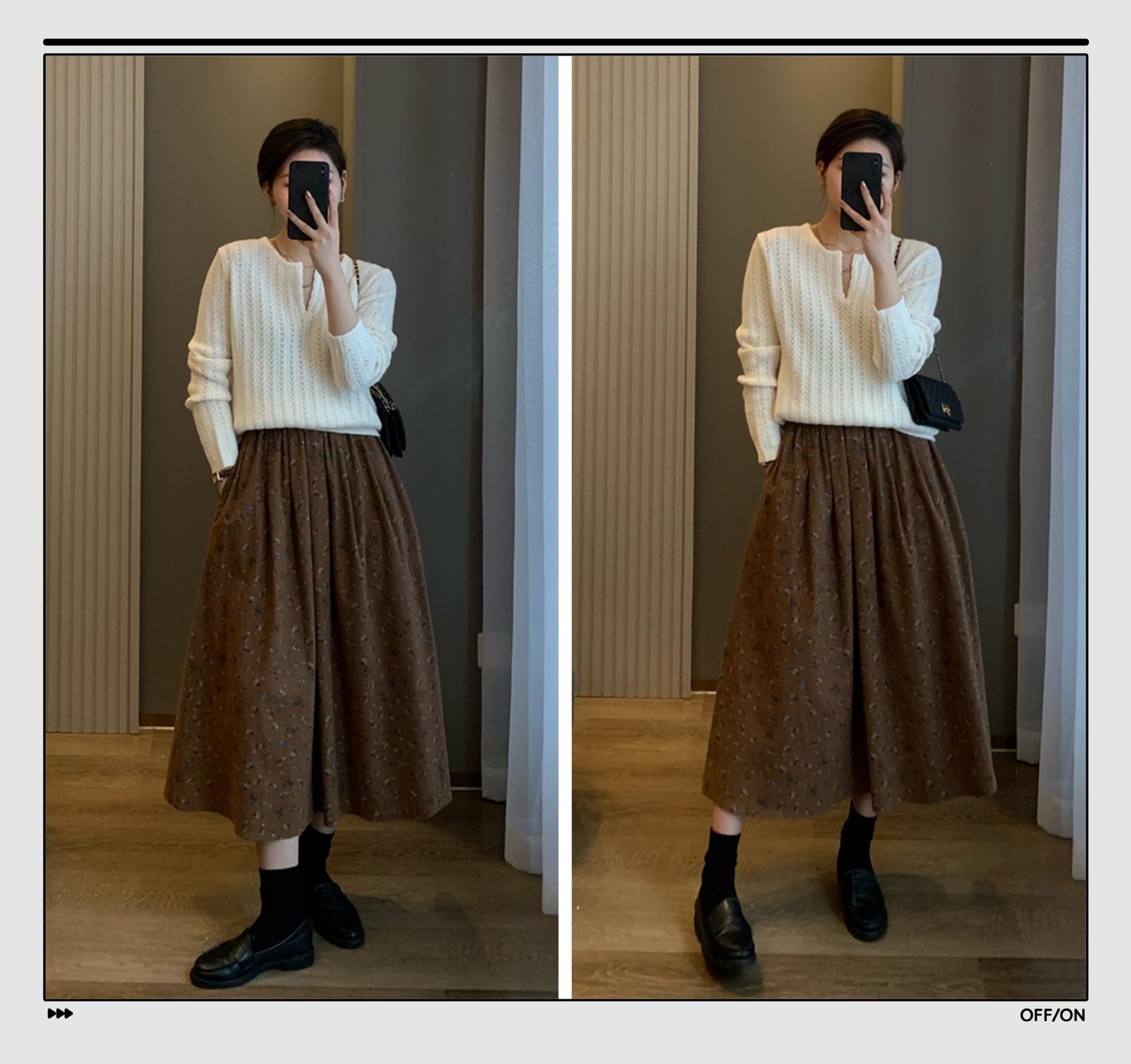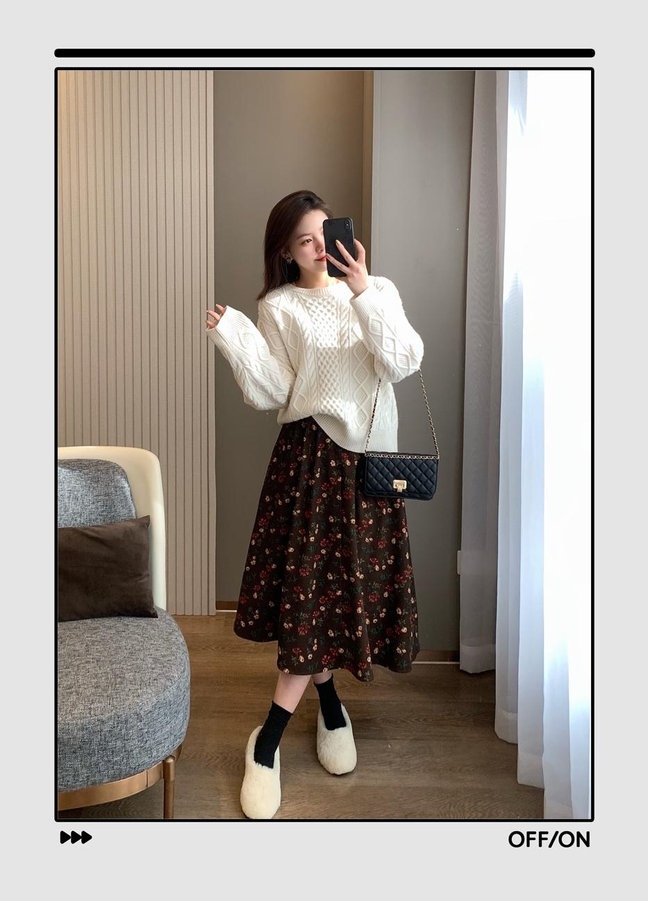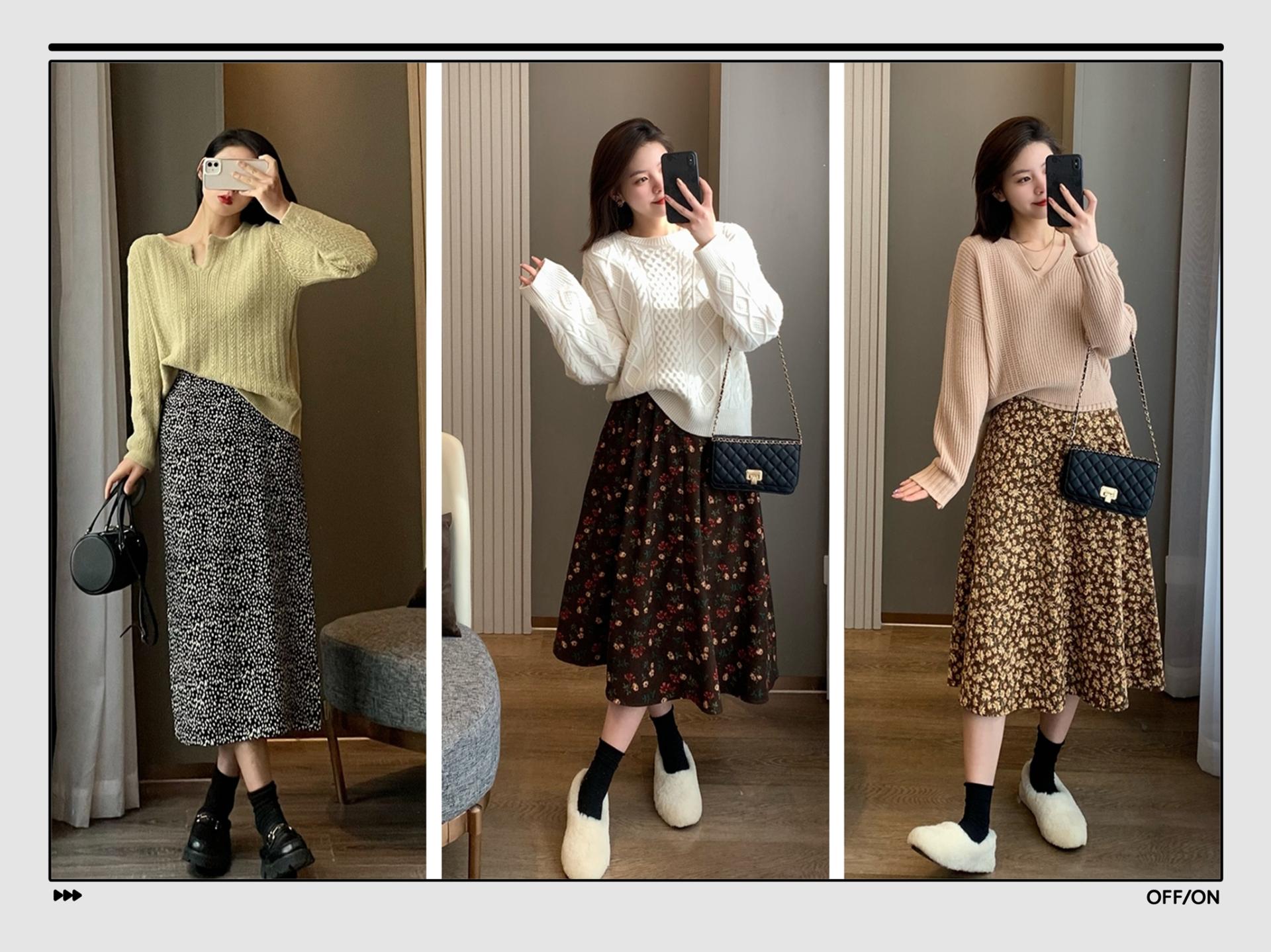 搭配一条色调比较深的高腰碎花裙,视线首先会被毛衣所吸引,这种技巧特别适合梨形身材的女生。