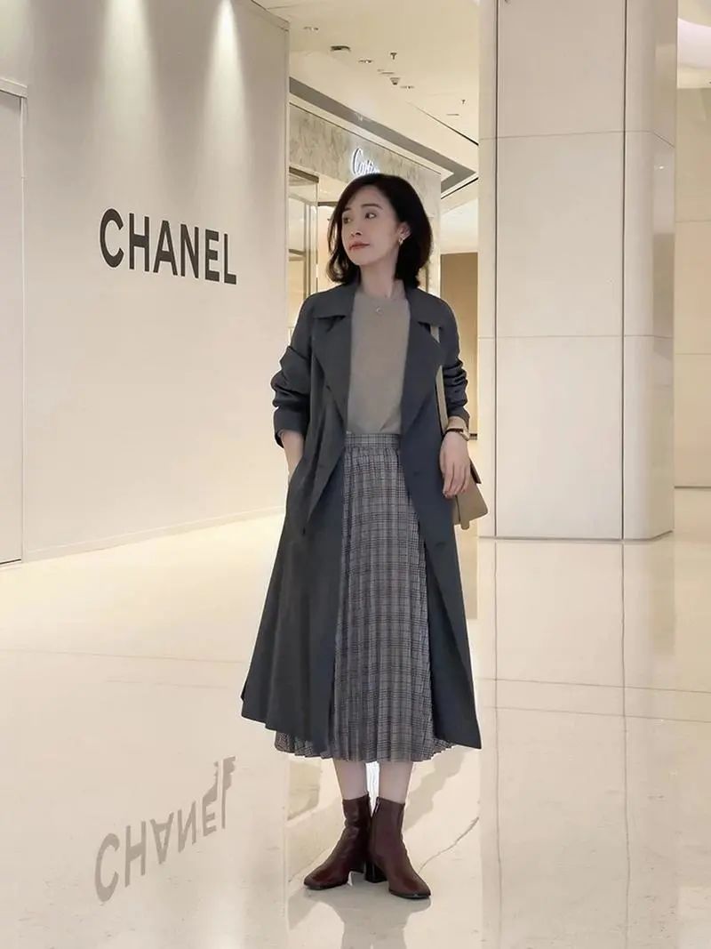 在与裙装搭配时,不要忘了再穿上一双短靴,短靴的好处不仅能用来凹造型,还能增高,让身材更修长高挑,相比普通的休闲鞋,靴子与风衣要更加匹配一些,更适合成熟的女性。