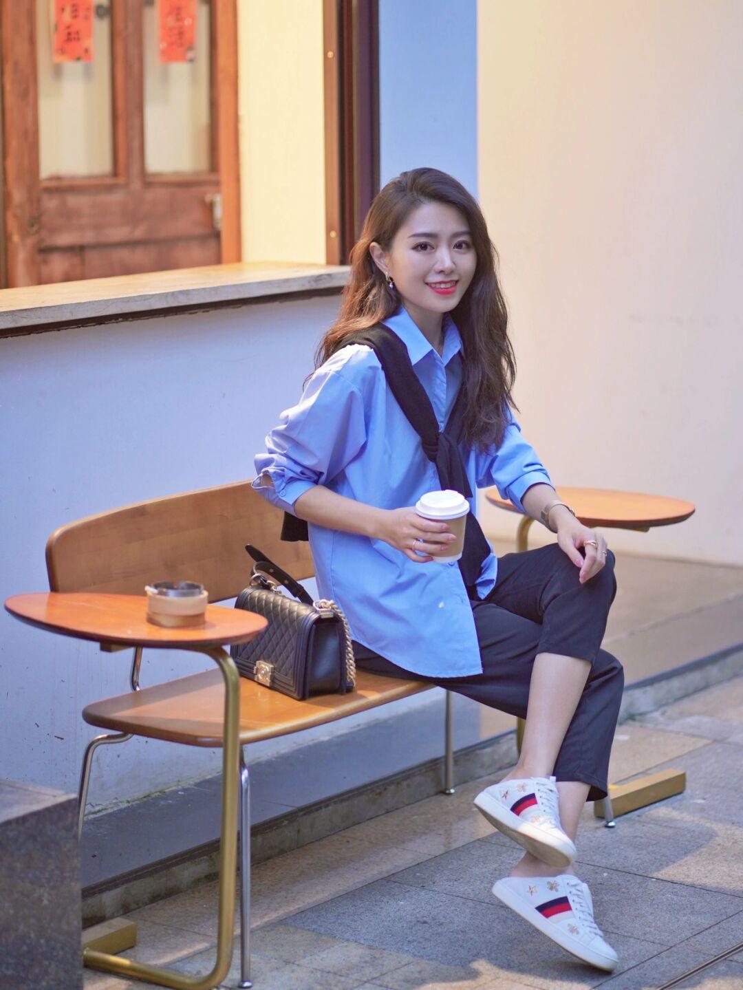 其实有一种很流行的穿法大家不太了解,就像这位博主在穿淡蓝色衬衫的时候,选择了一款长袖衫搭在肩膀上,这就是一个很大的亮点。其实即使纯色衬衫也不会让人觉得过于普通,并且这样的造型很适合在生活中选择,简约的同时又不乏个性和魅力。