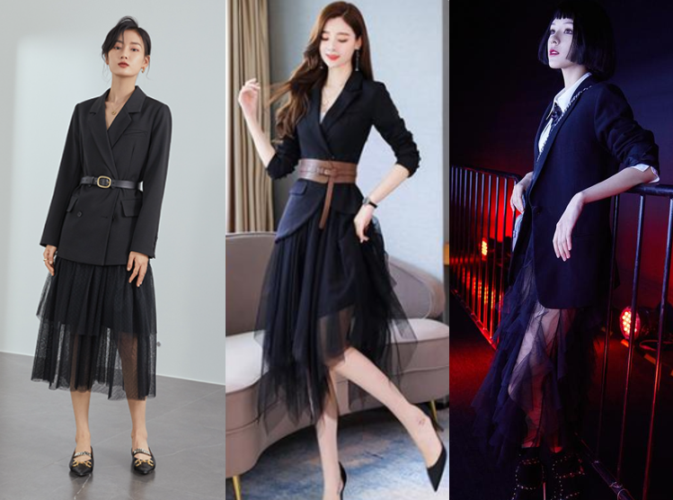 LOOK2:黑色小西装 + 不规则裙摆网纱裙